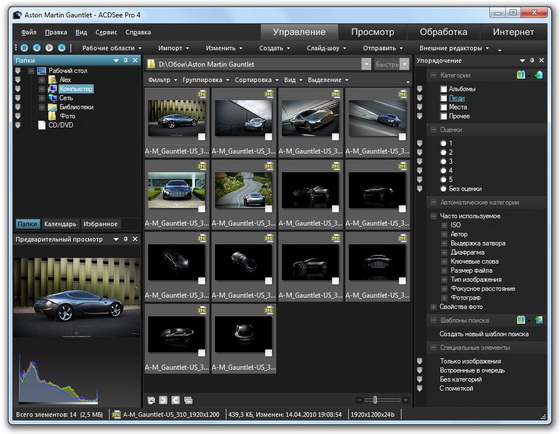 ACDSee Pro - профессиональная программа для работы с цифровыми фотографиями, которая обладает расширенным набором функций, рассчитанных на профессиональных фотографов. Поддерживает более 100 форматов графических файлов, позволяет работать с RAW-изображениями, автоматически сортировать фотографии по параметрам, полученным из цифровых фотокамер, содержит эффективный визуальный метод добавления к изображениям метатегов и быструю пакетную обработку большого количества картинок, в том числе и в RAW формате. Кроме того, здесь присутствуют инструменты для независимого регулирования цветовых каналов, исправления артефактов фотографий, появляющихся из-за погрешностей оптики, добавления "водяных знаков", работы с IPTC-метаданными, имеется возможность архивирования графических коллекций в ZIP-файлы, запись на CD или DVD и многое другое.