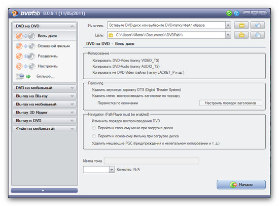 - Копировать на чистый DVD диск любого формата(DVD+R/RW, DVD-R/RW, DVD+R DL, DVD-R DL).