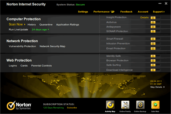 Norton Internet Security 2011 - новая версия пакета программ для комплексной защиты компьютера. Защищает от вирусов и вредоносных программ, защищает вашу личную информацию онлайн, и вы можете работать и играть в безопасности на своем ПК. Среди основных отличий пакета Norton Internet Security 2011 от предыдущих версий разработчики выделяют повышенную скорость работы, превентивное уведомление о негативном влиянии определенных приложений на общую производительность ПК, а также стойкую защиту персональных данных при поиске, совершении покупок и других операциях в Интернете.