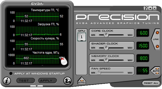 - управление частотами памяти и ядра, включая шейдерный блок (как раздельно, так и одновременно)
