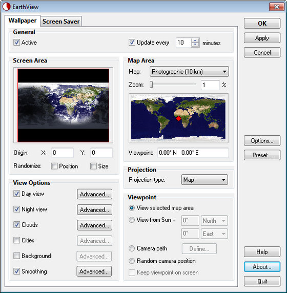 EarthView - это динамические обои и скринсейвер в виде карты нашей планеты или глобуса вращающегося синхронно с оборотом земли (поддерживает смену дня/ночи, облака, огни городов). EarthView может работать как скринсейвер, который создает высокодетализированные красивые виды земли (глобус или карта). Программу выделяют очень высокое качество изображения и насыщенные цвета. Все параметры генерации изображения гибко настраиваются, что позволяет подстроить качество изображения под производительность конкретного компьютера. С сайта разработчика можно скачать дополнительные (фотореалистичные) карты земной поверхности.