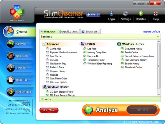 В комплект SlimCleaner входят утилита для деинсталляции приложений и «шредер» для безопасного уничтожения файлов, папок и т.д. Есть возможность анализировать содержимое меню автозагрузки и взаимодействовать с активными службами, а также генерировать журнал Hijack Log, подробного списка всех инструментальных панелей, браузерных «помощников», плагинов ActiveX и других объектов второстепенной важности, установленных в системе. С помощью предлагаемых инструментов пользователи смогут добиться максимально производительной работы системы.