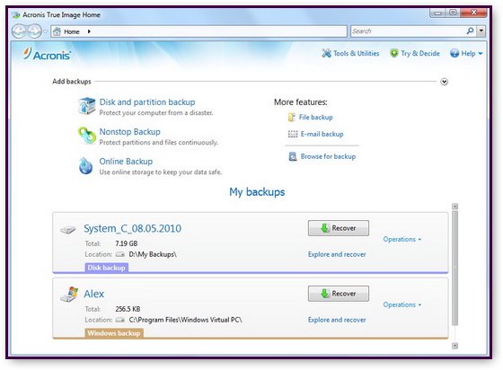 Новые средства слияния резервных копий позволяют экономить дисковое пространство и избежать путаницы с файлами. Теперь можно объединитьпервоначальную полную резервную копию с существующими инкрементными в один файл и производить последующее инкрементное копирование на основе нового полного. - Интерфейс программы в стиле Windows Vista®