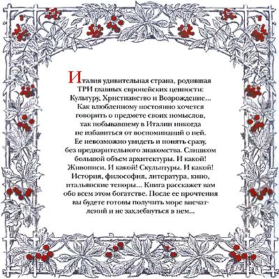 Путеводитель познакомит вас с историей Италии за 2500 лет, с великими художниками, архитекторами, скульпторами, кондотьерами, императорами, римскими папами и дожами, великими династиями. Один из лучших современных итальянских гидов проведет вас по самым знаменитым городам. Путеводитель написан в стиле эссе с остроумными комментариями. Эту книгу нельзя отложить: она читается запоем. Откройте ее...