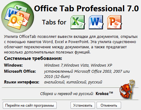 Скачать программу Office Tab Professional 7.0 RePack by Krokoz (9,32 МБ):