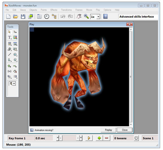 KoolMoves - программа для создания анимационных эффектов в формате Macromedia Flash (.SWF) и кадров для анимированных GIF-файлов и анимации в других популярных форматах. В программе имеется: инструментарий для рисования объектов различной формы, импорт векторной графики, добавление звуковых файлов, множество различных эффектов, в том числе текстовые эффекты, добавление действий к тексту и кадрам. Программа также имеет готовые шаблоны, библиотеку кнопок и векторных заготовок.