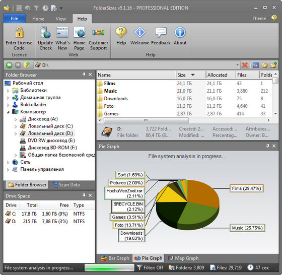 Эта программа позволит вам провести проверку жестких дисков на наличие на них свободного места. Если вы никак не можете понять, почему места осталось так мало, запустите FolderSizes Pro, и программа создаст для вас полный отчет. Программа сгенерирует диаграммы, которые наглядно покажет, какие папки занимают больше всего места. Среди возможностей программы: Распечатка отчетов, экспорт их в HTML; Экспорт диаграмм в файлы JPEG, PNG, BMP или TIFF; Система создания отчетов по типам файлов, которые занимают больше всего места.