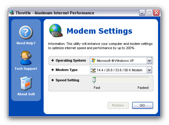 Throttle - утилита предназначена для настройки параметров ваших модемов на максимальное быстродействие, что в результате может привести к более чем 200-процентному увеличению скорости работы. Вы просто выбираете свою OS, тип соединения (14.4/28.8/33.6/56k, кабельный модем, DSL/ADSL модем, ISDN, Satellite, T1/T3/OC3/OC12+, локальная сеть) и нажимаете кнопку "Go". Остальное программа сделает сама! Как отмечают разработчики, программа изменит ряд ключевых параметров работы модема, например, улучшит определение сигнала "занято", уменьшит количество обрывов связи и т.д. Программа работает со всеми типами модемов подо всеми операционными системами семейства Windows.