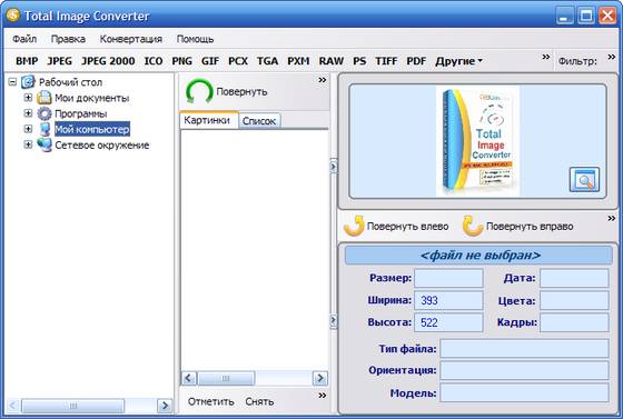 Total Image Converter - преобразует изображения в другие форматы, изменяет размеры и переворачивает фотографии и картинки. Total Image Converter сделает всё, что вам нужно: вы можете конвертировать большие TIFF изображения в маленькие JPEG, подгонять картинки под размеры веб-страницы или преобразовать RAW фотографии в более популярные форматы.
