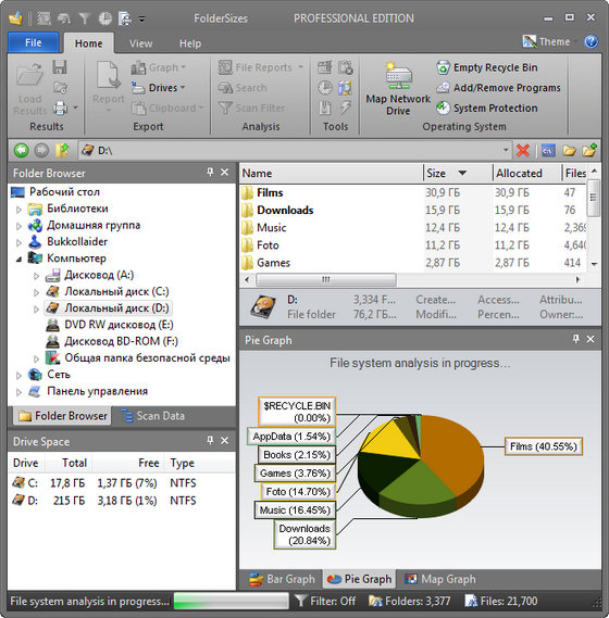 Эта программа позволит вам провести проверку жестких дисков на наличие на них свободного места. Если вы никак не можете понять, почему места осталось так мало, запустите FolderSizes Pro, и программа создаст для вас полный отчет. Программа сгенерирует диаграммы, которые наглядно покажет, какие папки занимают больше всего места. Среди возможностей программы: Распечатка отчетов, экспорт их в HTML; Экспорт диаграмм в файлы JPEG, PNG, BMP или TIFF; Система создания отчетов по типам файлов, которые занимают больше всего места.