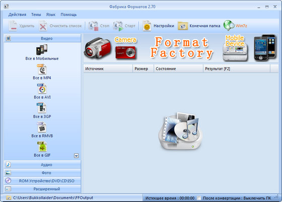 FormatFactory - многофункциональный конвертер различных файлов мультимедиа. Имеет рад дополнительных функций, превращающих FormatFactory в универсальный инструмент для работы с мультимедийными файлами разных форматов. Поддерживается конвертация популярных видеоформатов в MP4, 3GP, MPG, AVI, WMV, FLV, SWF, а также конвертация аудиоформатов в MP3, WMA, MMF, AMR, OGG, M4A, WAV. В FormatFactory есть функция преобразования изображений в форматы JPG, BMP, PNG, TIF, ICO, GIF, PCX, TGA. Среди дополнительных возможностей FormatFactory есть такие, как увеличение и вращение изображений, присвоение им тегов, а также восстановление поврежденных аудио и видеофайлов.