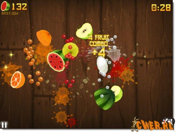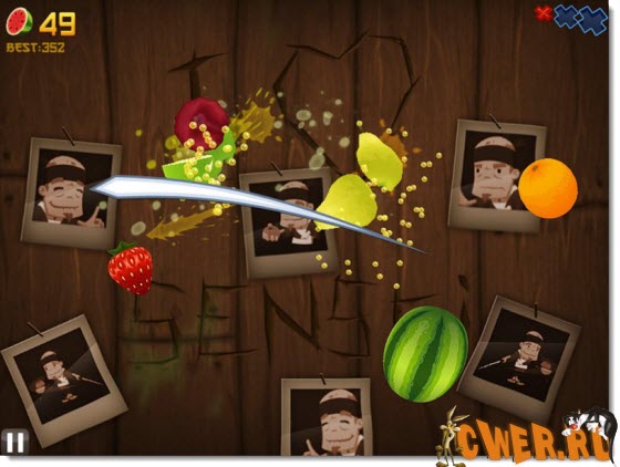 Как у всякого настоящего ниндзя у нас есть катана, а еще у нас есть фрукты… Мы режем и режем, постоянно подлетающие фрукты. Все вроде бы элементарно и скучно, но так ли это? Ведь иногда подбрасываются бомбы, просто когда фруктов много, то их можно и перепутать. У вас только три жизни и если вы пропускаете три фрукта, то игре конец, но каждую сотню разрезаных фруктов вы получаете дополнительную жизнь. Ну и наконец последняя трудность: фон коричневый, а значит если взлетели несколько ярких фруктов и на пример киви, то вы его можете не заметить.А так же там есть zen режим: вам дается полторы минуты, но без бомб и жизней.