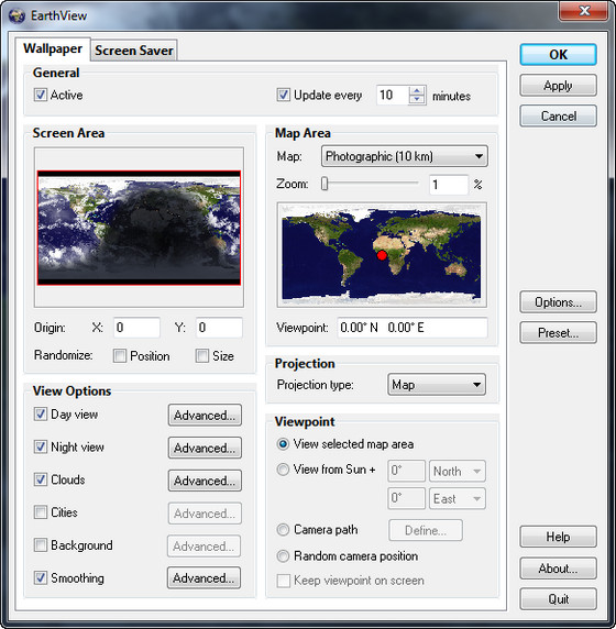EarthView - это динамические обои и скринсейвер в виде карты нашей планеты или глобуса вращающегося синхронно с оборотом земли (поддерживает смену дня/ночи, облака, огни городов). EarthView может работать как скринсейвер, который создает высокодетализированные красивые виды земли (глобус или карта). Программу выделяют очень высокое качество изображения и насыщенные цвета. Все параметры генерации изображения гибко настраиваются, что позволяет подстроить качество изображения под производительность конкретного компьютера. С сайта разработчика можно скачать дополнительные (фотореалистичные) карты земной поверхности.