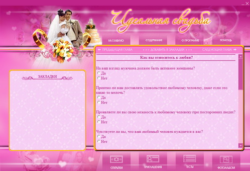 Чтобы ваш праздник не омрачался ненужными бытовыми проблемами и прошел именно так, как вы хотите, была разработана мультимедийная энциклопедия "Идеальная свадьба".