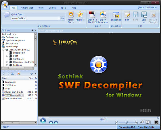 Скачать программу Sothink SWF Decompile 6.3 Build 3221 (25,24 МБ):