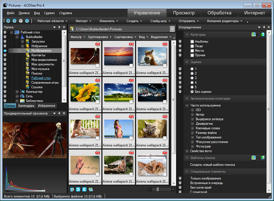 ACDSee Pro - профессиональная программа для работы с цифровыми фотографиями, которая обладает расширенным набором функций, рассчитанных на профессиональных фотографов. Поддерживает более 100 форматов графических файлов, позволяет работать с RAW-изображениями, автоматически сортировать фотографии по параметрам, полученным из цифровых фотокамер, содержит эффективный визуальный метод добавления к изображениям метатегов и быструю пакетную обработку большого количества картинок, в том числе и в RAW формате. Кроме того, здесь присутствуют инструменты для независимого регулирования цветовых каналов, исправления артефактов фотографий, появляющихся из-за погрешностей оптики, добавления "водяных знаков", работы с IPTC-метаданными, имеется возможность архивирования графических коллекций в ZIP-файлы, запись на CD или DVD и многое другое.