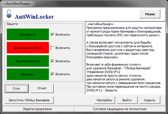 Программа AntiWinLocker - легкая и быстрая в отличие от антивирусов ввиду того, что она не занимается постоянным поиском вирусов, а лишь защищает уязвимые места операционной системы Windows, не давая вирусам типа trojan.winlocker "закрепиться" в Вашем компьютере