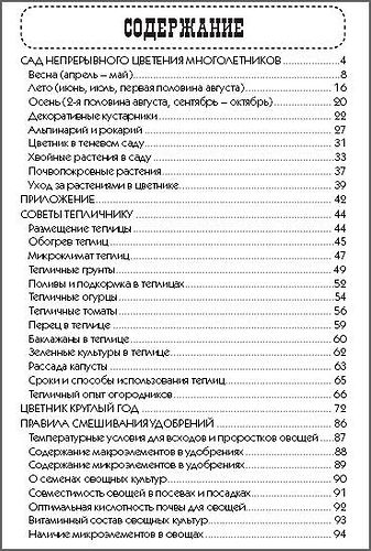 В популярном ежегодном справочнике приведены подробные рекомендации по созданию на участке сада непрерывного цветения многолетников. Представлен ряд распространенных культур, подходящих как для небольших участков, так и для обширных площадей, занятых цветником. Вторая часть справочника содержит советы огородникам и раскрывает секреты выращивания наиболее популярных овощных культур в теплицах.