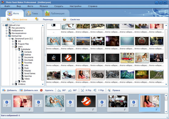 Photo Flash Maker Professional программа для создания анимированного FLASH-слайдшоу из обычных цифровых фотографий. Данная утилита предоставляет более 200 эффектов перехода одной фотографии в другую, имеет различные темы внешнего оформления и позволяет устанавливать музыкальное сопровождение. В настройках утилиты можно указать продолжительность показа отдельной фотографии и время ее перехода в другое изображение.