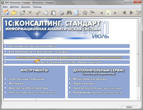 Информационная Аналитическая Система (ИАС) "1С:Консалтинг. Стандарт" - это ежемесячно обновляемая информационная аналитическая система, предназначенная для юридического сопровождения предприятия.