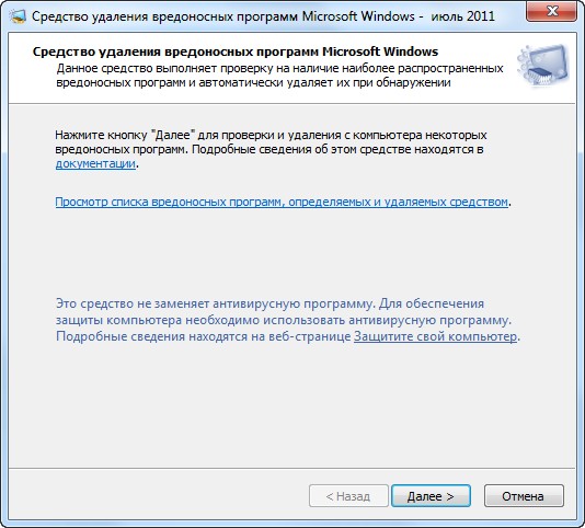 Microsoft Malicious Software Removal Tool - утилита для обнаружения и удаления наиболее распространённых вирусов. Microsoft Malicious Software Removal Tool выполняет проверку компьютера на наличие наиболее распространенных вредоносных программ (включая Blaster, Sasser и Mydoom) и удаляет их в случае обнаружения. Поскольку компьютеры, будучи зараженными, на первый взгляд могут работать нормально, специалисты из Microsoft рекомендуют запустить данное средство даже, если вам кажется, что с компьютером все в порядке. Утилита не требует инсталляции. С её помощью сканирование системы на наличие вирусов занимает всего несколько секунд. Из дополнительных опций можно отметить предоставление детальной информации о том или ином вирусе, распознаваемом утилитой (для этого нужно кликнуть мышкой на название вируса и перейти на сайт Microsoft с информацией о нём).