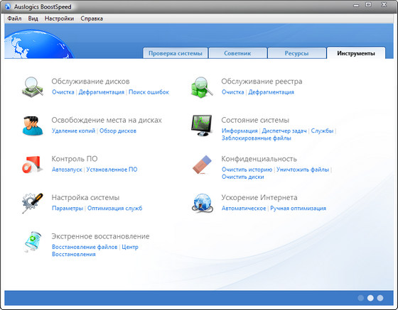 AusLogics BoostSpeed - популярная утилита для ускорения работы системы Windows, программ и Интернет-соединения от компании AusLogics. Программа оптимизирует компьютерную память, ускоряет загрузку Windows, повышает быстродействие Microsoft Office, The Bat, FireFox, Opera, Skype, чистит реестр и диск компьютера. Четвертая версия программы включает в себя знаменитый Auslogics Disk Defrag и набор новых утилит для современных компьютеров. После дефрагментации реестра BoostSpeed, скорость компьютера возрастет за счет уменьшения фрагментации файлов реестра, уменьшения их размера, а также благодаря устранению ошибок в реестре. Помимо этого данная программа предлагает мощные возможности очистки реестра и диска, что в свою очередь позволит вашему компьютеру работать более быстро и эффективно. Имеет приятный пользовательский интерфейс и поддержку русского языка