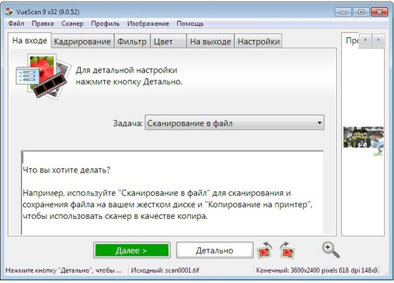 VueScan Pro - программа для работы со сканерами HP, Minolta, Nikon, Polaroid, Epson, Canon и другими. Может работать с внутренней глубиной цвета. VueScan поддерживает автоматическую и ручную настройку большинства параметров и пакетный режим сканирования. Поддерживается более 500 моделей сканеров с определенным перевесом в сторону слайд-сканеров — Nikon, Minolta, Polaroid, Microtek, Epson. Предусмотрено автоматическое удаление дефектов изображения за счет канала инфракрасного сканирования и многопроходное сканирование с последующим усреднением результата — для подавления собственных шумов сканера. Имеются фильтры подавления зерна, нерезкого маскирования и удаления паразитного оттенка оригинала. Есть средства ручной корректировки динамического диапазона и градационной характеристики (независимо по каналам R, G, B).