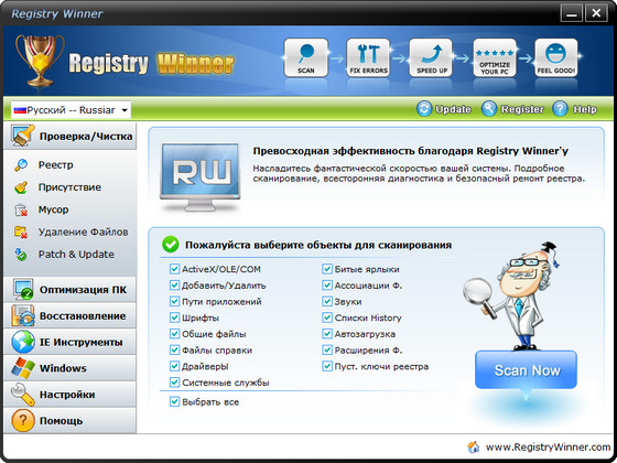 С использованием Registry Winner на регулярной основе ваша система будет поразительно стабильна. Registry Winner сканирует весь компьютер на возможные ошибки, которые ведут к проблемам в реестре. Происхождение у них может быть разное, но для программы это не имеет значения – она справиться со всем легко и быстро.