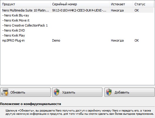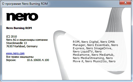 - в составе, по выбору: Nero Express + Burning ROM или Nero Express или Nero Burning ROM * SecurDisc * Nero CoverDesigner * Nero WaveEditor * Nero DiscSpeed * Nero InfoTool * Nero BurnRights