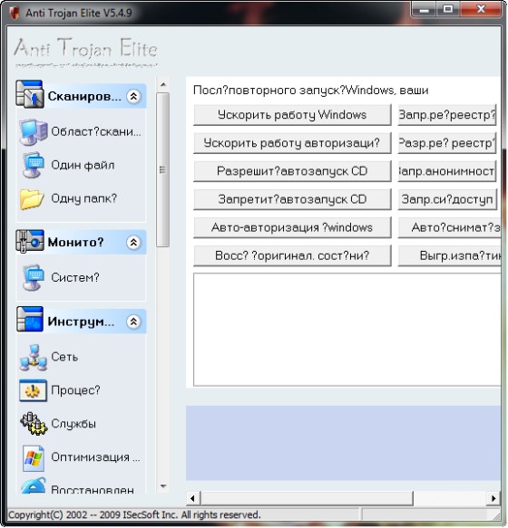 Anti-Trojan Elite - программа для очистки компьютера от вредоносных файлов, таких как трояны, кейлогеры и прочих. Anti-Trojan сканирует не только жесткий диск (включая архивы ZIP CAB), но и смотрит на то, какие процессы запущены. Также располагает менеджером сетевых процессов, при помощи которого можно определить, где запущен нежелательный процесс. Кроме этого, вы можете просмотреть ключи и значения реестра и удалить подозрительные, починить Internet Explorer, оптимизировать работу Windows и многое другое.