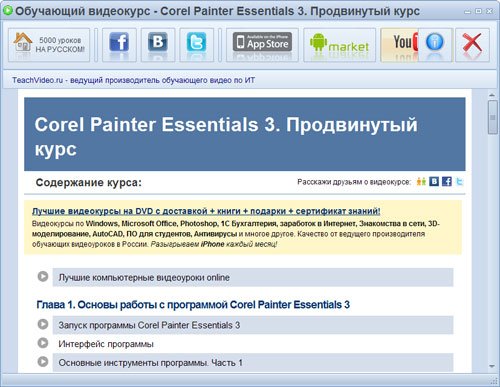 А также важные функции: добавление художественных эффектов в изображениях, управление глубиной цвета экспорт и импорт в графические форматы PhotoShop , TIFF, JPEG, BMP, GIF, EPS, PAINT SHOP PRO. Файл представляет собой удобную оболочку, после установки которой, вы сможете просматривать видеокурс в хорошем качестве и разрешении.