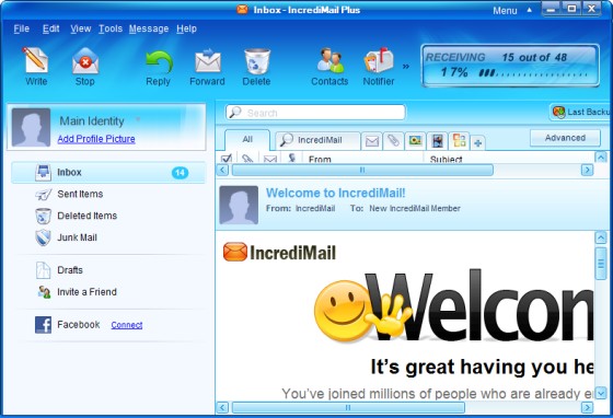 Внешний вид программы тоже необычный - весёлый и красочный, к тому же он поддается изменению с помощью скинов; необычно и то, что в программе использован речевой синтезатор, сообщающий о приходе почты и других событиях. В остальном же IncrediMail качественный почтовый клиент, поддерживающий работу с несколькими почтовыми ящиками, с возможностью предпросмотра писем прямо на сервере и удалением тех из них, что не нужны, с удобной системой сортировки писем за счёт создания правил их обработки и со всеми другими атрибутами, присущими современным почтовым программам, включая поддержку безопасного включая поддержку SSL-соединения. Естественно, отправлять письма можно не только в HTML, но и в текстовом формате, а также в виде звукового письма.
