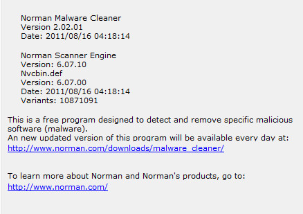 Norman Malware Cleaner - бесплатная программа для сканирования, обнаружения и удаления из системы разнообразного вредоносного ПО. Имеет обширную базу данных вирусных записей, которая включает различные варианты опасных программ семейства Blaster, Mydoom, Mytob, Netsky, Rootkit, Sasser и многих других.