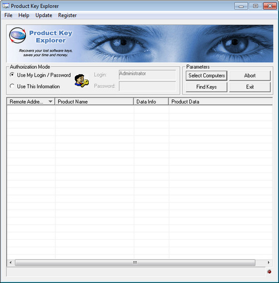 Product Key Explorer быстро восстанавливает и показывает ключ продукта для Windows 7, Windows Vista, Windows XP, Microsoft Office, Adobe Photoshop, Adobe CS5, CS4, CS3, SQL сервер, игры Electronic Arts и больше чем 3000 популярных программных продуктов, установленных в сетевых компьютерах.