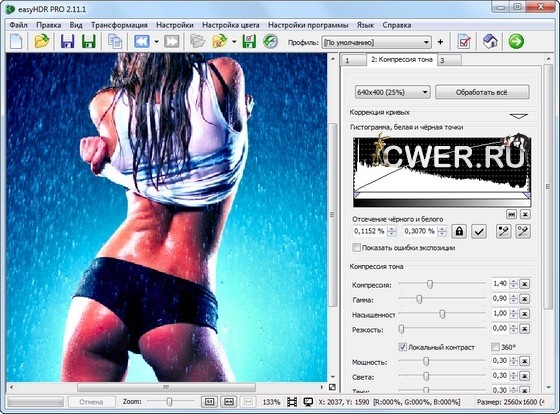 easyHDR Pro - позволяет формировать HDRI из TIF, JPG и BMP-файлов, открывать формат Radiance, выровнять исходные изображения, проводить тональную компрессию. При модифицировании очередного параметра программа не бросается вычислять тональную компрессию, для этого надо нажать Preview. Вычисления можно неизменно остановить. Дабы работа шла быстрее, можно выделить только участок изображения, для которого будет изображен результат тональной компрессии. Позволяет подмечать обрезанные светлые и неясные участки. Очень неплохая программа с удобным удобопонятным интерфейсом и большим числом опций. Более эластичная, чем Photoshop, результаты тональной компрессии смотрятся более натуральными, чем из Photomatix.