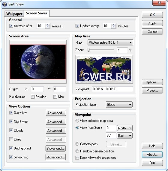 EarthView - это динамические обои и скринсейвер в виде карты нашей планеты или глобуса вращающегося синхронно с оборотом земли (поддерживает смену дня/ночи, облака, огни городов). EarthView может работать как скринсейвер, который создает высокодетализированные красивые виды земли (глобус или карта). Программу выделяют очень высокое качество изображения и насыщенные цвета. Все параметры генерации изображения гибко настраиваются, что позволяет подстроить качество изображения под производительность конкретного компьютера. С сайта разработчика можно скачать дополнительные (фотореалистичные) карты земной поверхности.