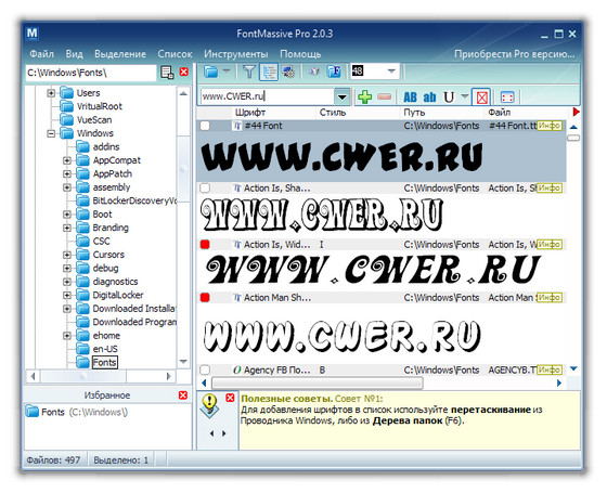FontMassive - список шрифтов, установка/удаление, таблица символов, просмотр символов в кривых, снимки состояний установленных шрифтов, мн. другое.