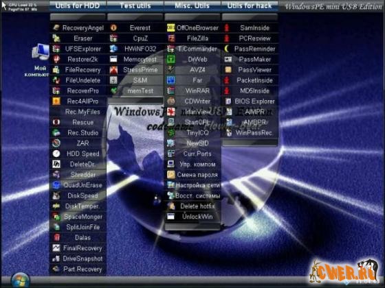 - Встроен LiveCD от xaser - Windows PE Mini CD Edition версии от 02.08 (содержимое на последнем скриншоте)