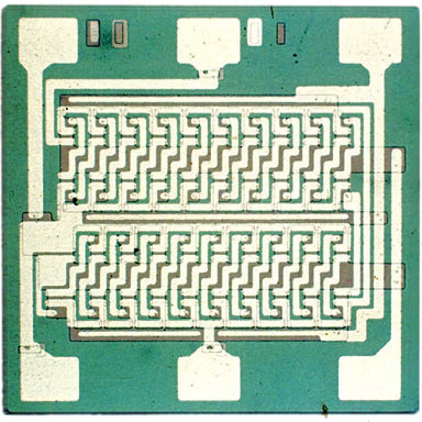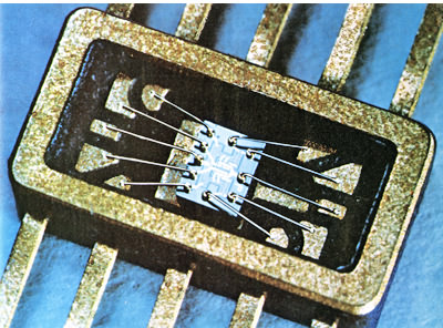 Кристалл первой «современной» микросхемы (1960 г.) — триггера с 4 транзисторами и 5 резисторами.
