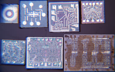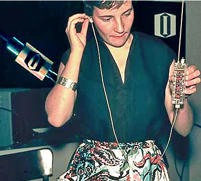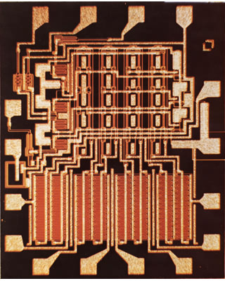 Правда, пока этот процесс подходил лишь для изготовления отдельных кристаллов. Но уже тогда стало ясно, что микросхем понадобится не меньше, чем дискретных элементов, а значит их производство должно быть более массовым. К счастью, в 1958 г. Джэй Лэст и Роберт Нойс построили один из первых фотоповторителей, позволявших на одну пластину проецировать множество копий маски. А в 1961 г. выпущены первые промышленные фотоповторители с уменьшением изображения — теперь маску можно сделать в 5–10 раз больше, что упрощало процесс её подготовки. Маски изготавливались переносом выполненных на прозрачной плёнке чертежей на лист рубилита, на котором координатограф полуручным способом гравировал оттиск. Сами чипы изготавливались из пластин диаметром всего 13⅓ мм, введённых в 1960 г. Право называться первой коммерческой оспаривают микросхемы Fairchild и Texas Instruments. Кстати, Уильям Шокли также достиг массового производства своего диода, но так и не добился успеха — потому что появились микросхемы, где 3–6 транзисторов могли заменить такой диод. (Вставить сюда фразу про злобного буратино — прим.авт.)