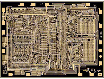 Всемирно известный Intel i4004 являлся первым 1-кристальным коммерчески доступным ЦП, продававшимся в т.ч. отдельно (в отличие от AL1), хотя разработан был для конкретной модели калькулятора. Дизайнеры чипа — Федерико Фэггин и Тед Хофф из Intel и Масатоши Шима из Busicom. Этот 4-битный ЦП не умел наращивать разрядность, зато обошёлся всего в 2300 транзисторов. Тем не менее, Фэггину пришлось применить разнообразные ухищрения, чтобы уместить чип в размерах, приемлемых для рентабельного производства и узкого 16-выводного корпуса.