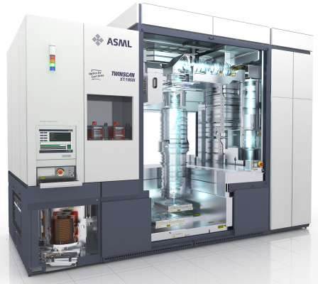 Современный литографический сканер ASML TwinScan 1950i. Луч лазера, пройдя через многочисленные линзы и движущуюся взад-вперёд маску (её каретка видна справа от надписи TwinScan) попадает на каретку с экспонируемой пластиной, которая также движется, но уже в двух координатах, подставляя под луч новую порцию поверхности. Вторая каретка со следующей «вафлей» в этот момент проходит подготовительную стадию, в которой различные оптические датчики изучают малейшие неровности этой конкретной пластины, чтобы далее оптимизировать её экспонирование — двухстадийный конвейер. Слева от рабочей зоны видны входной и выходной порты для контейнеров с пластинами по 25 штук в каждом, а сверху (между надписью и кареткой маски) — банк масок, подставляющий нужную для данной экспозиции и имеющий собственный небольшой порт. «Светофор» — это индикатор состояния, встроенный почти в каждую установку в «чистой комнате» фаба.