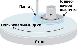 Химико-механическая планаризация: вращающийся подвес прижимает пластину лицевой стороной к вращающемуся диску с наносимой на него пастой. Специальный диск-восстановитель (не показан) выравнивает пасту. Восстановитель и подвес также могут двигаться вдоль радиуса.
