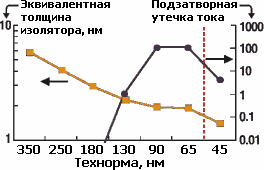 График толщины подзатворного изолятора в SiO2-эквиваленте и относительной утечки тока. Введение высокопроницаемых изоляторов для техпроцесса 45 нм позволило уменьшить эквивалентную толщину для улучшения скорости, увеличив физическую толщину для уменьшения утечек.