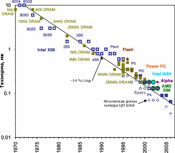 Технорма наиболее сложных микросхем. Падает также их цена — правда, не вдвое (исходя из примерно половинной площади чипа для данного числа транзисторов — за исключением последних техпроцессов…), а примерно в 1,5 раза при каждом переходе на очередной техпроцесс (т.к. он сложнее и дороже на каждую единицу площади). По какой причине физическая длина затвора (не только для ЦП Intel) оказывается меньше технормы — читайте ниже.