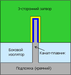 «Трёхзатворный» транзистор на деле означает транзистор с каналом, окружённым затвором (через прослойку в виде тонкого изолятора, обозначенного жёлтым) с трёх сторон — по сравнению с планарным, где поверхность сопряжения представляет собой одну плоскость.