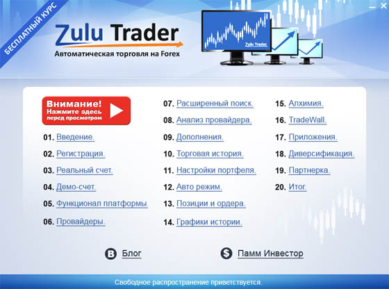 Всего 20 уроков курса максимально доступно и ясно раскрывают основные тонкости работы с автоматической web-платформой ZuluTrade - от регистрации до получения первой прибыльной сделки.