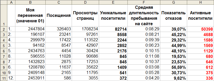 Экспортируем отчет в формат, совместимый с Microsoft Excel, и добавляем в него столбец "Активные посетители", значение каждой ячейки которого вычисляем по формуле, указанной в строке формул: