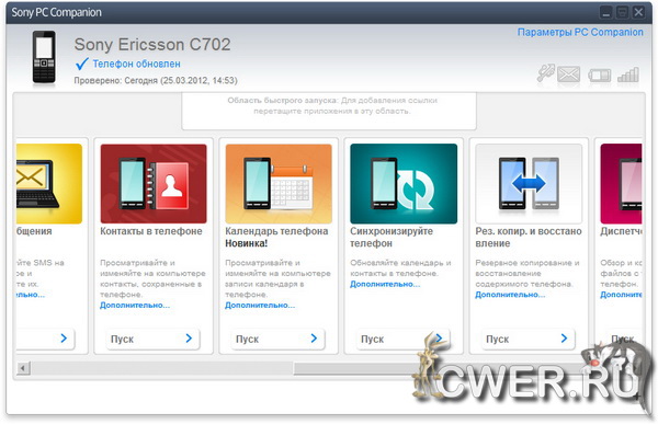 PC Companion — компьютерное приложение, выступающее в качестве портала, на котором представлены функциональные инструменты и приложения Sony Xperia и оператора связи, например обновления программного обеспечения телефона, средства управления контактами и календарем, а также инструменты Media Go для работы с мультимедийными материалами (доступность приложений зависит от оператора и модели телефона). Со временем на портал могут добавляться новые приложения, выпускаемые компанией Sony Xperia или вашим оператором связи. Такие приложения также можно будет загружать.