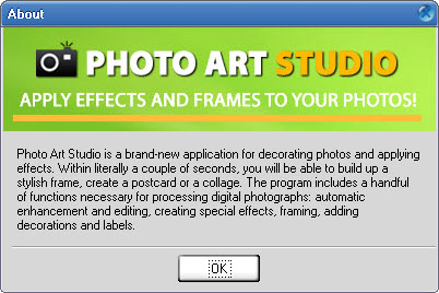 Photo Art Studio - представляет собой новое программное обеспечение для украшения фотографий. В комплект входит пакет из пяти удобных программ для создания открыток, коллажей, наложения рамок и пакетной обработки фотографий. В течение буквально нескольких секунд, вы сможете создать стильную рамку, создать открытку или коллаж. Программа включает в себя небольшое число функций, необходимых для обработки цифровых фотографий: автоматическое редактирование, создание специальных эффектов, кадрирование, добавление украшений и знаков.